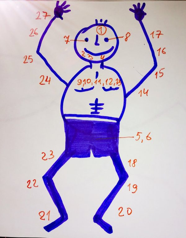 Щоб визначити вплив Шанідєва на людину потрібно намалювати фігуру людини з номерами її частин тіла і потім за цією схемою розподілити всі накшатри …